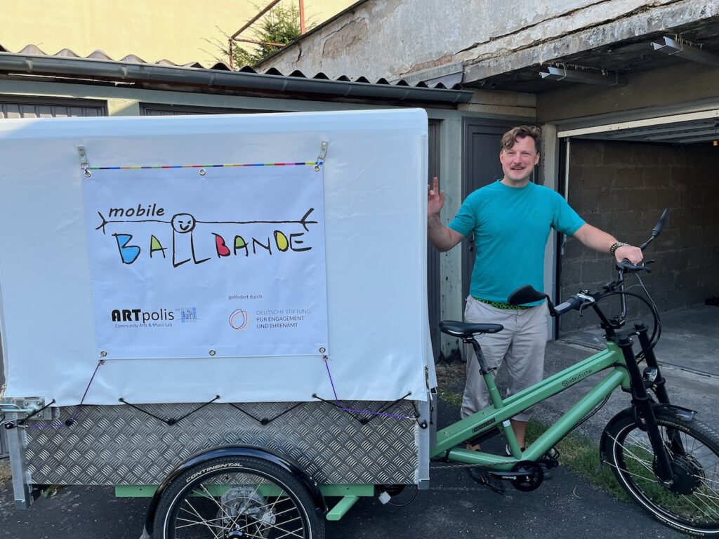 Aus diesen Einsätzen heraus entstand eine weiterführende Zusammenarbeit: Auch Migrapolis hat eine eigene Ballbande für das Lastenrad entwickelt und individuell gebrandet.