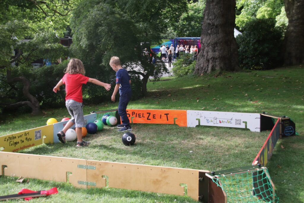 Mit der Ballbande mobil brachten wir spontane Spielaktionen direkt zu den Besucherinnen und Besuchern des Parks. Parallel dazu entstand gemeinsam mit Kindern und Jugendlichen in einem Workshop eine dauerhafte Ballbande, die den Park auch über das Event hinaus als Spielort stärkt.